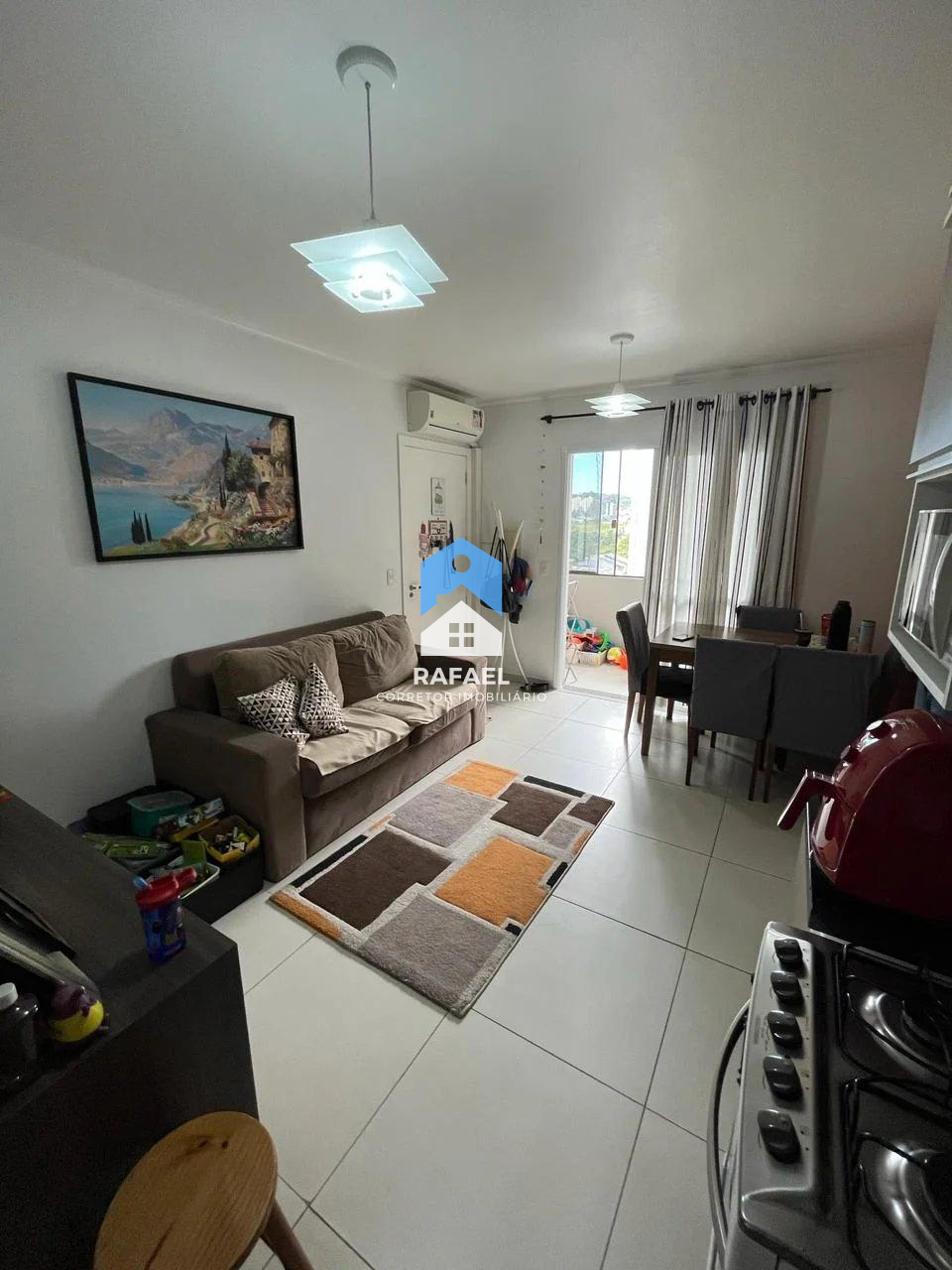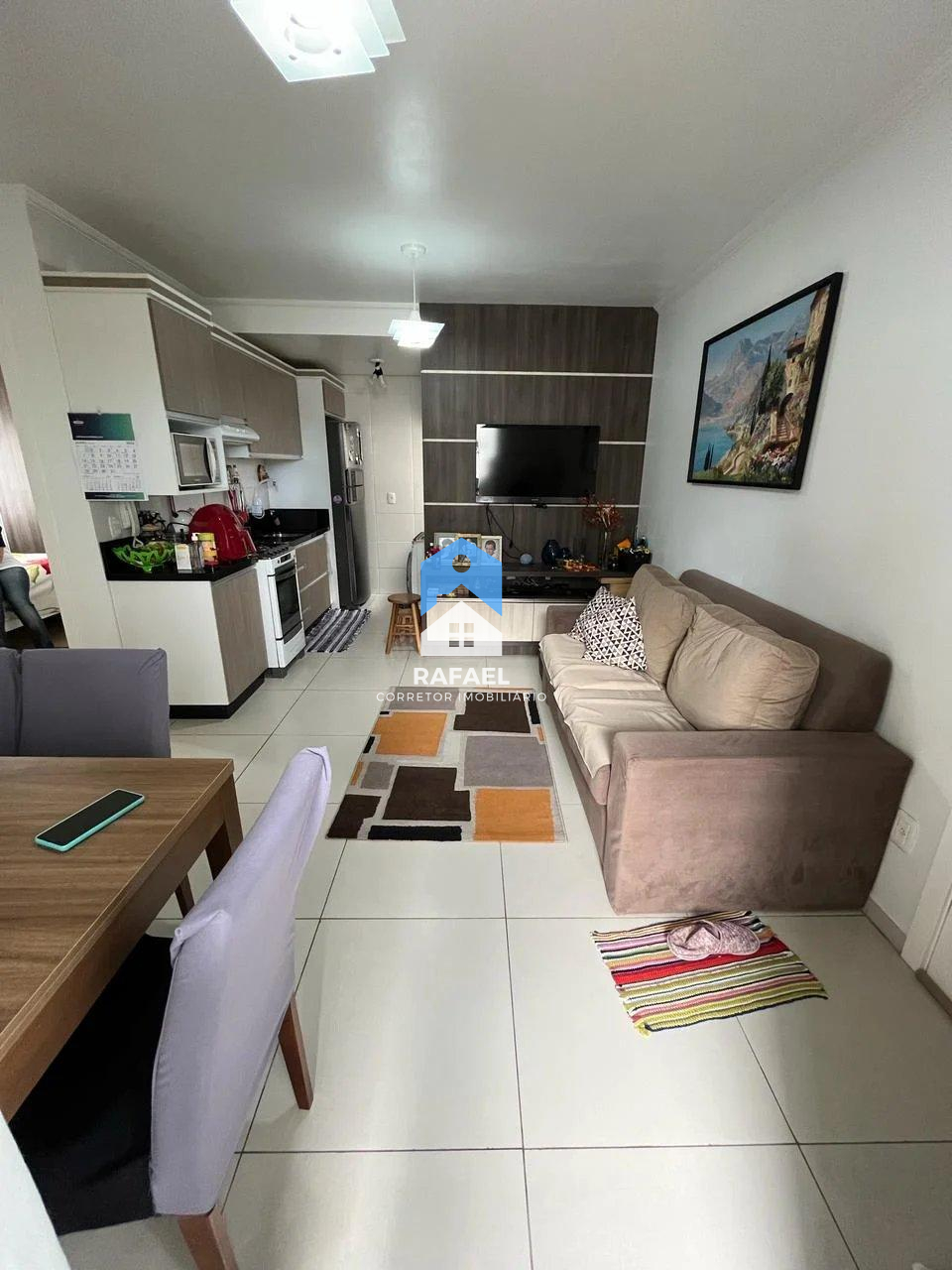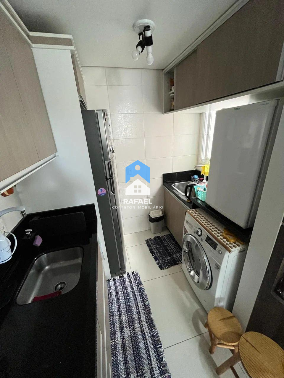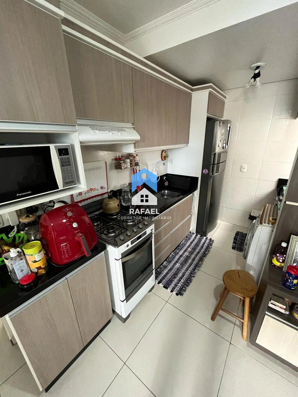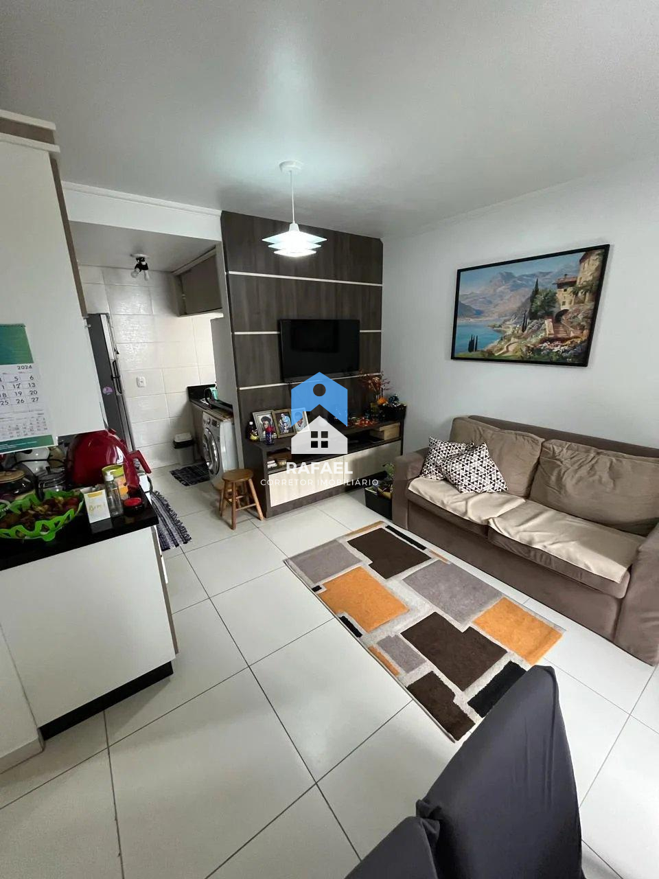 Ficam os móveis fixos da cozinha, quartos e banheiro.